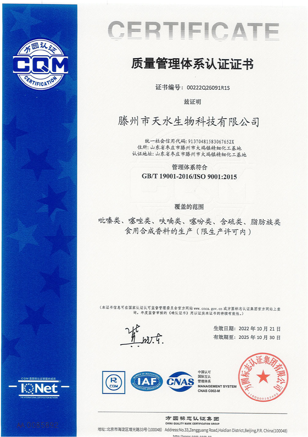 滕州市天水生物科技有限公司成立于2011年9月,是目前國內(nèi)雜環(huán)類合成食品香料、日化香料和醫(yī)藥中間體生產(chǎn)經(jīng)營的綜合性企業(yè)。坐落于山東省滕州市生物醫(yī)藥產(chǎn)業(yè)基地,總投資5000余萬元,占地面積約30000平方米,員工百余人。公司先后被評為高新技術(shù)企業(yè)、專精特新中小企業(yè)、科技型中小企業(yè),建有市級重點實驗室1處,并先后獲得ISO9001質(zhì)量體系認(rèn)證、ISO22000食品安全體系認(rèn)證、kosher認(rèn)證和Halal認(rèn)證。是香精香料及食品配料協(xié)會會員單位及滕州市中小企業(yè)協(xié)會理事單位。